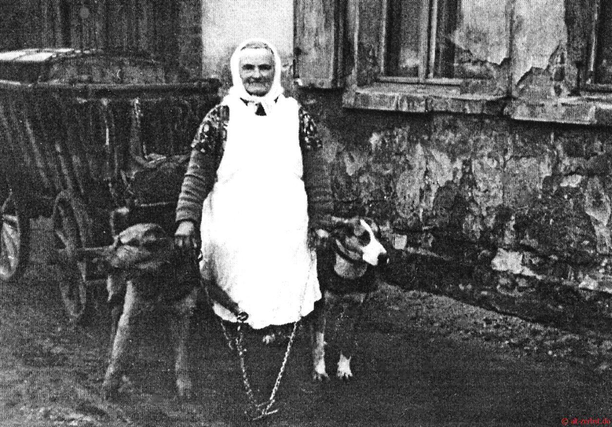 So war jeder Fluchtversuch des Tieres vom Wagen ausgeschlossen. Beiderseits der Deichsel waren zwei starke Hunde mit angespannt, welche dann im Ledergeschirr die anhängende Last mit zogen.