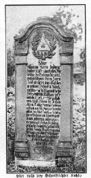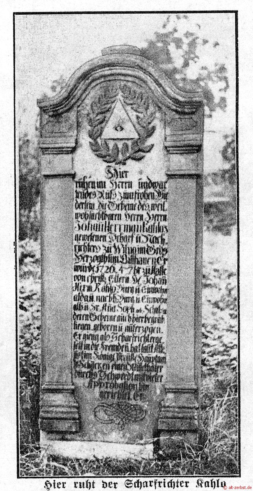 Der in Sandstein gehauene Text lautet: Hier ruhen im Herrn und warten des Rufs zum frohen Wiedersehn die Gebeine des weil. Wohlachtbaren Herrn Johan Kahlos gewesener Scharf- und Nachrichter zu Wilno im Großherzogtum Litthauen. Er wurde 1726 den 4. Februar zu Halle von christlichen Eltern: Herrn Hermann Kahlo, Bürger und Einwohners alhier und Frau Anna Sophie geb. Schützen, deren Gebeine auch hier begraben liegen, geboren und auferzogen. Er ging als Scharfrichtergesell in die Fremde und hat laut Attentat im Königlich Preußischem Hauptamte Schaaken (heute Amtsbezirk Schaaken, im Landkreis Königsberg/ Samland ) einen Missetäter durch das Schwert mit vieler Aprobation (Zulassungen) hingerichtet.
