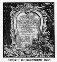 Die letzte Hinrichtung in Zerbst und im Ankuhn durch das Schwert fand im Jahre 1822 statt. Der Raubmörder August Lutter wurde auf einem leeren Feld vor dem Heidetor vollzogen. Bei der Pulspforder Straße unmittelbar hinter der links liegenden ehemaligen Müllkippe liegt heute noch sichtbar auf einer kleinen Anhöhe, der Galgenberg. Wie aber nun die kleine Vorstadt Ankuhn dazu kam, den Scharfrichter hier wohnen zu lassen, erfahren wir aus seinem Grabstein, der heute in den Kirchenmauern von St. Marien aufbewahrt wird.