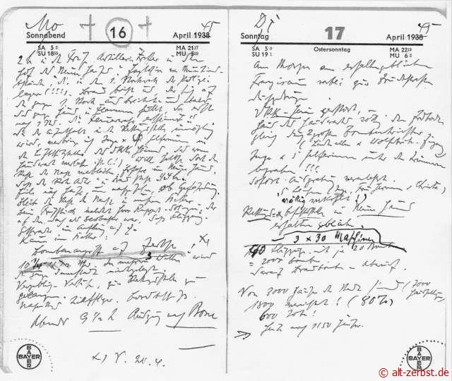 In seinem Kriegstagebuch, persönliche Aufzeichnungen in einem Taschenkalender des Jahres 1938 und aus der Not auf das Jahr 1945 umgeändert, schrieb er: „Am Tag nach dem Bombenangriff (1. Angriff der Stadt am 14. April) trat eine unheimliche Stille ein bis am Abend der Artilleriebeschuss mit Brandgranaten wieder einsetzte. In der Rettungsstelle im Neuen Haus kamen Verletzte mit vielen Brandwunden. Auch Dr. Stein (ebenfalls ein Arzt in Zerbst) und Inge mit vier Helferinnen kommen. Den ganzen Abend worden Notverbände angelegt.“