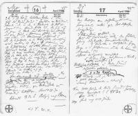 Er schreibt: „17. April 1945 – Am Morgen am erhalten gebliebenen Francisceum vorbei zur Brüderstraße vorgedrungen Das DRK – Heim zerstört, des Haus dem Erdboden gleich – zwei große Bombentrichter. Sofort Ausgrabung veranlasst. Inge und Helferinnen unter den Trümmern begraben!!!