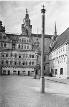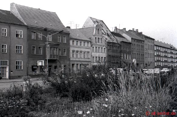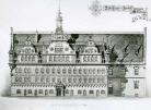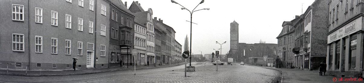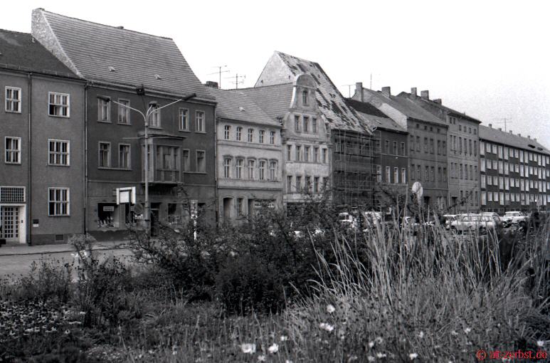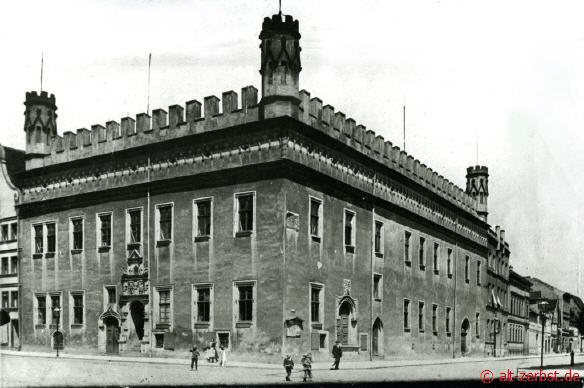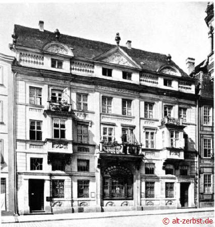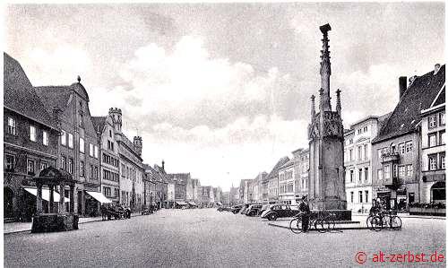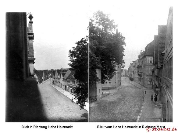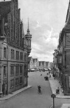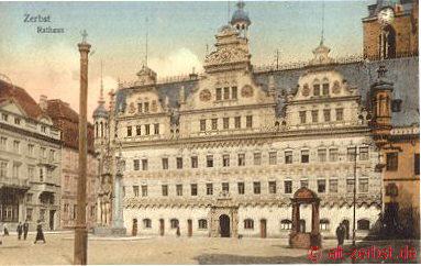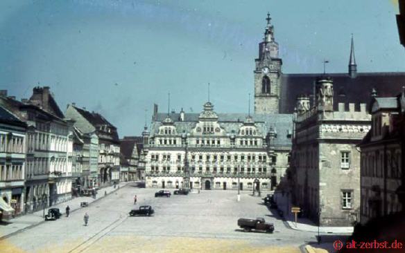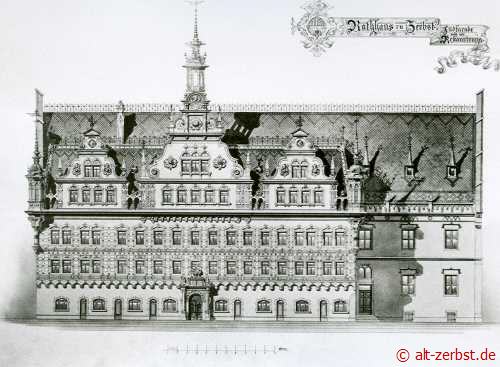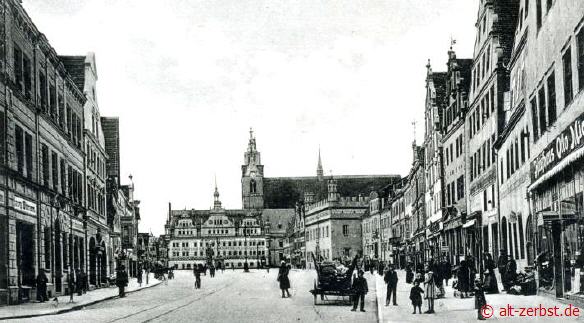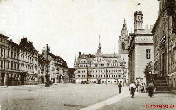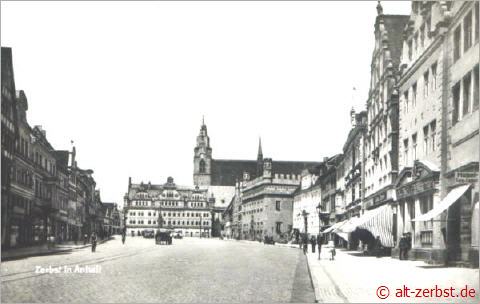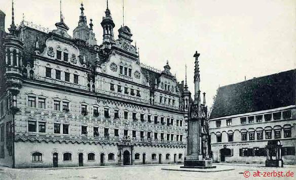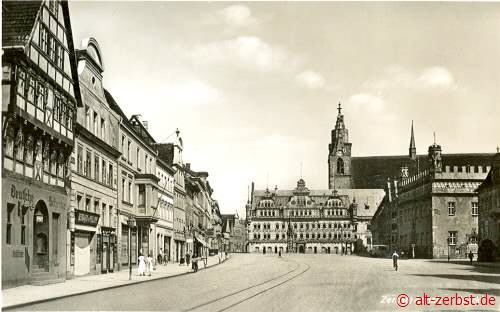 es bedeutete nicht nur eine künstlerische Huldigung an den neuen Zeitgeist der Renaissance, der Bau war eben so sehr als Kauf-und Gewandhaus mit über 100 Verkaufsständen in seinen Sälen und Räumen für den Zerbster Marktverkehr ein wirtschaftliche Notwendigkeit. Auf der Marktseite prangte der Bau mit einem herrlichen Renaissanceportal. Rechts geht der Blick in Richtung Brüderstrasse.