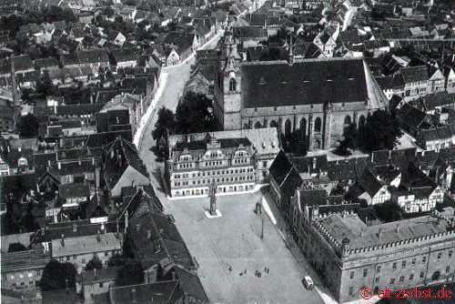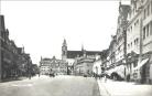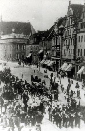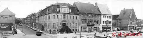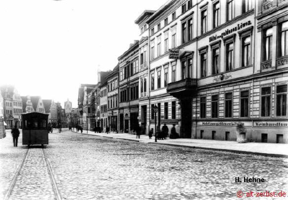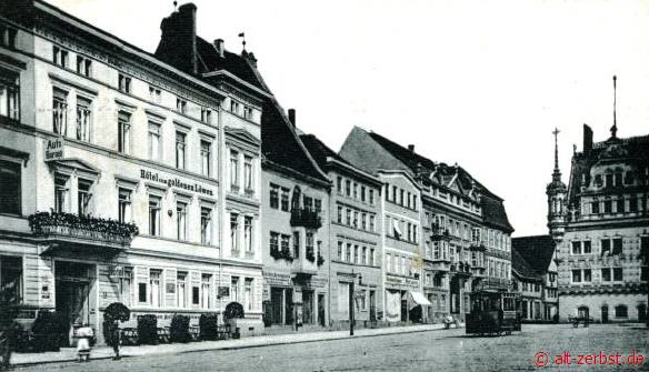 auf den alten Zerbster Marktplatz mit Pferdebahn und rechts dem "Hotel zum goldenen Löwen"