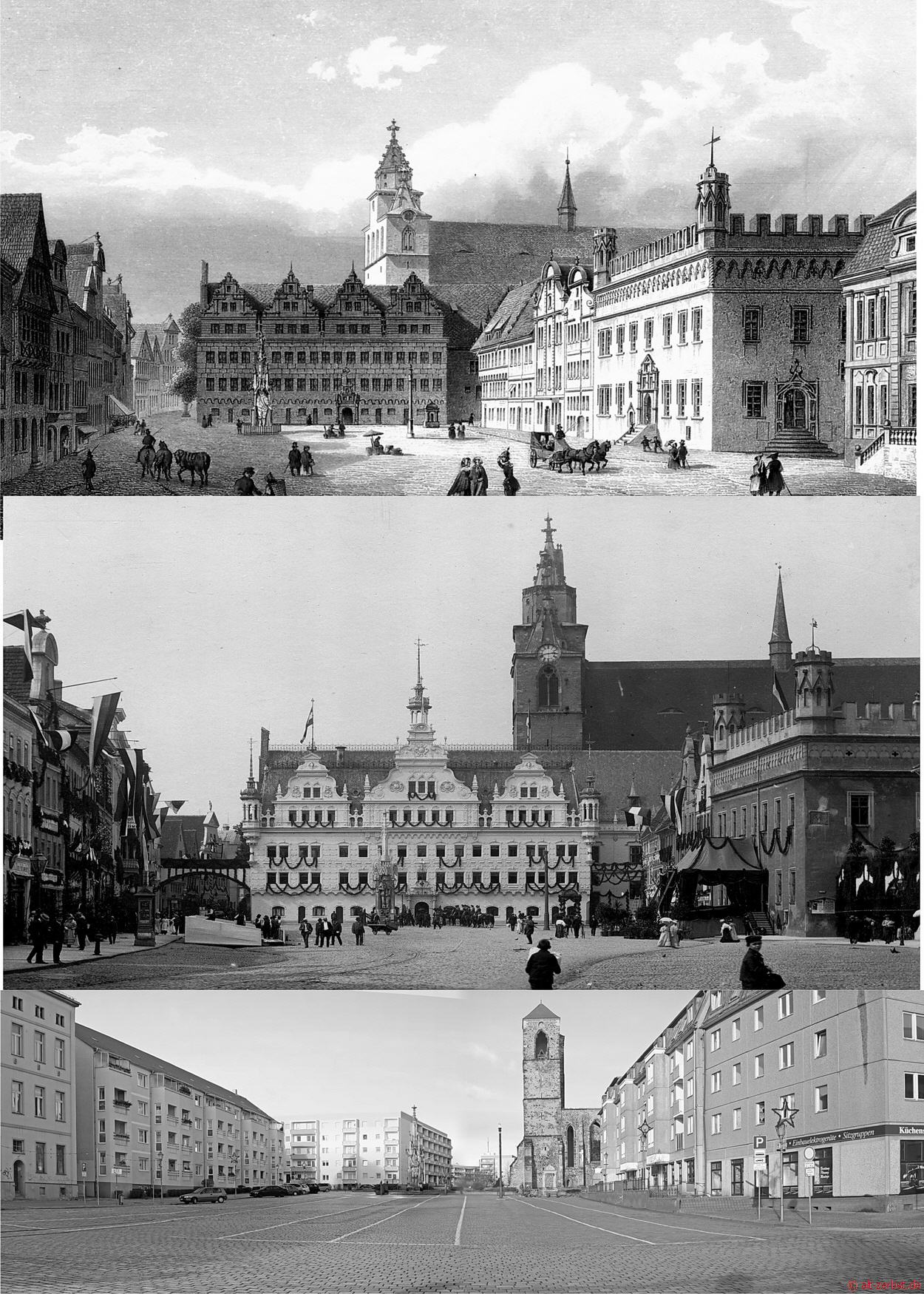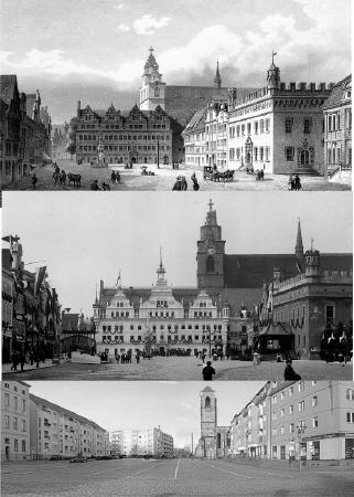 im Wandel der Zeiten. Oben nach einem Stich von Pozzi um 1850. In der Mitte macht sich der Markt hübsch für die anstehende 900 jährige Jubelfeier der Stadt Zerbst vom 15. bis 17. Juni 1907. Der untere Teil des des Bildes stammt aus dem Jahre 2009. Auch hier hat sich bereits bis heute vieles wieder verändert.