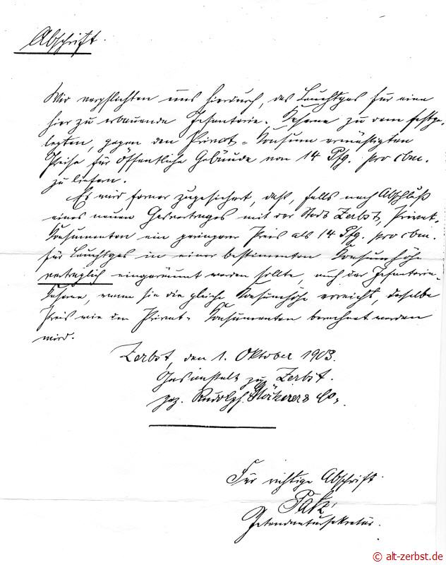1911 dann der Neubau eines Gasometers. Der 2000 m⊃3; Kessel wurde durch einen größeren mit 4000 m⊃3; Fassungsvermögen neu errichtet. Im Weiteren, so 1924 machte sich aus rein finanziellen Gründen die Einstellung der Eigenerzeugung und der Bau einer Versorgungsleitung von Dessau nach Zerbst notwendig.