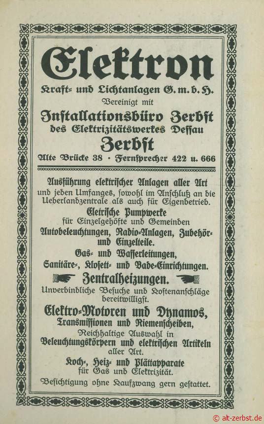 Um die Jahrhundertwende gab es erste Zerbster Unternehmen, welche sich vom verhältnismäßig teuren Gas für Beleuchtung abkoppelten, es waren:Fa. Franz Braun, DessauerstraßeLederfabrik Nebelung, MühlenbrückeDruckerei Zeidler, MarktSie verfügten über eine eigene Stromversorgung.(R.Specht)