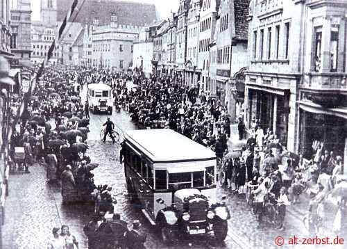 nach fast 37 Jahren Betrieb fuhr der letzte Wagen der letzten städtischen Pferdebahn durch die Stadt Zerbst. Man entschied sich für zwei weniger kostenaufwendige Kraftomnibusse der Kommanditgesellschaft Böhlmann. Leider konnte kein Pferdebahnwagen der Nachwelt erhalten bleiben. Foto: Archiv Verlag Kenning