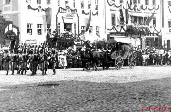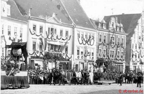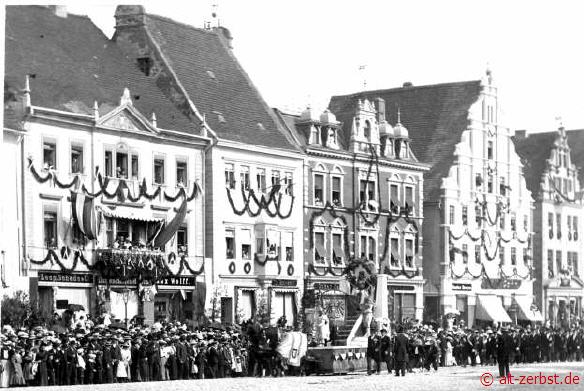 eine große Jubelfeier in Zerbst veranstaltet. Hier ein Teil des Festumzuges auf dem Markt.