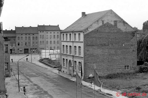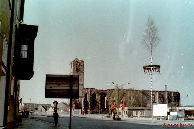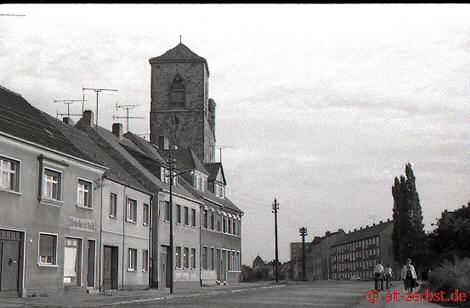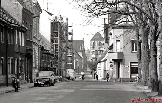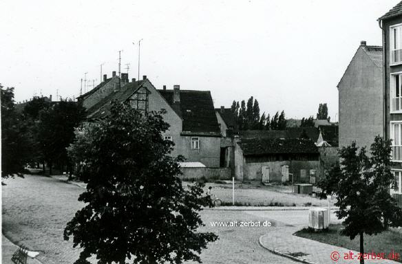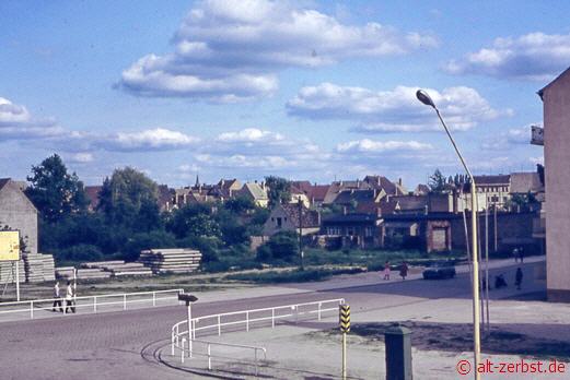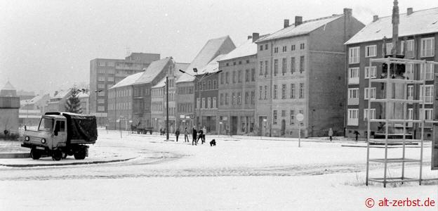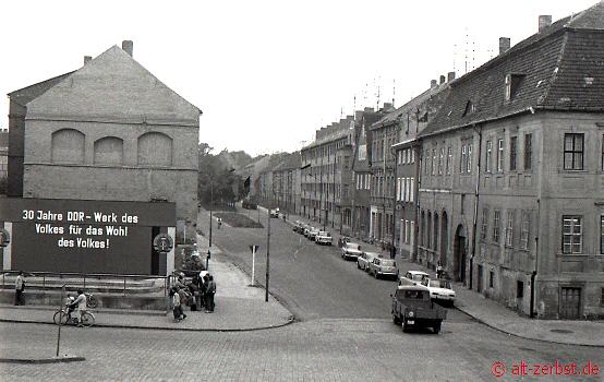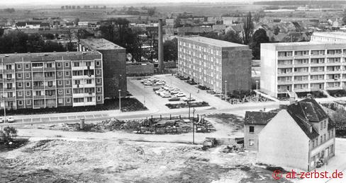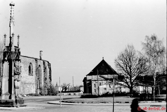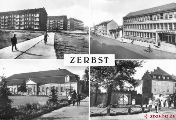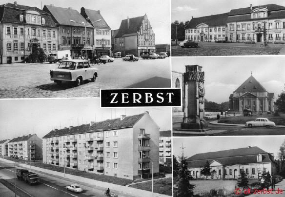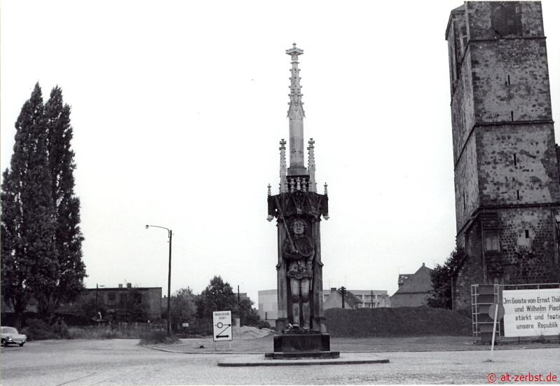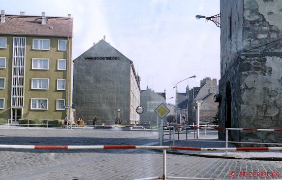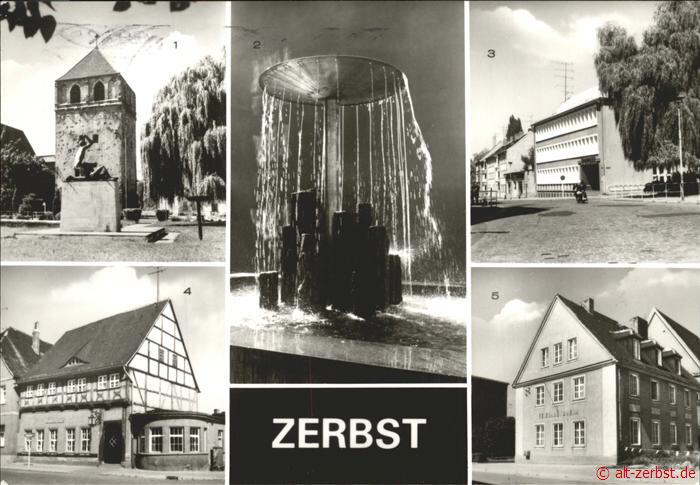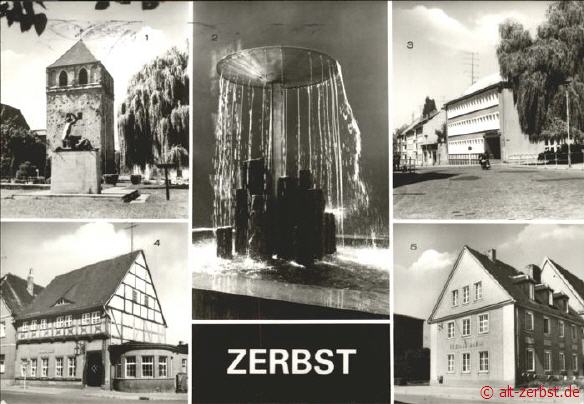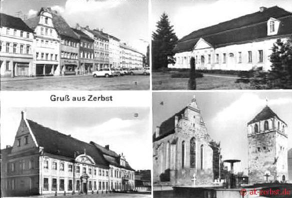 hier der Dicke Turm mit Mahnmal, dem Gildehaus, der alten Sparkasse, dem ehemals schönsten Zerbster Brunnen und dem Pflegeheim am Plan.