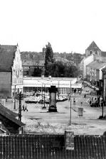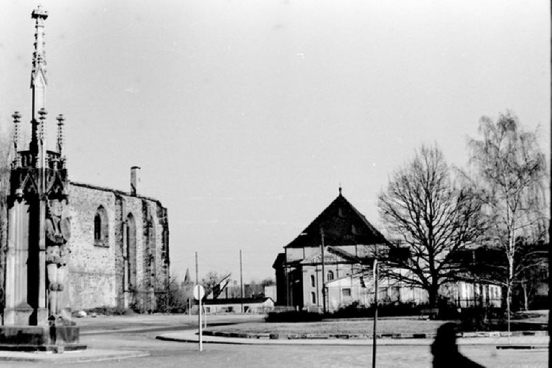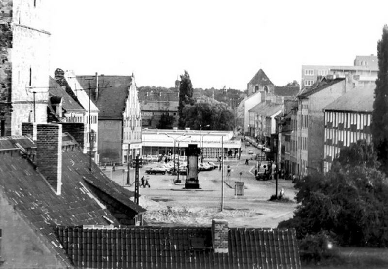 mit Markt, Fuhrstraße (dam. Otto-Grothewohl-Str.), Schlossfreiheit, Roland mit Trinitatiskirche und Stadthalle