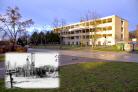 Wohnblocks Am Teufelstein, Alte Brücke, Stadthalle, Innenhof Gymnasium Francisceum
