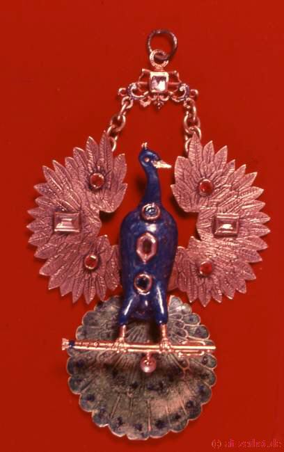 Ein Pfeilbolzen, an dem noch zusätzlich eine Perle hängt mit der Jahreszahl 1593, hält er in den Fängen. Die zugehörige Kette mit dem alleinigen Vogel daran ist wohl bis zum Jahre 1607 bekannt.