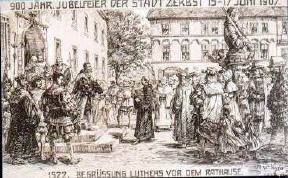 | 1522 - Begrüssung Luthers vor dem Rathause | 1582 - Errichtung des Gesamtgymnasiums durch Fürst Joachim Ernst |