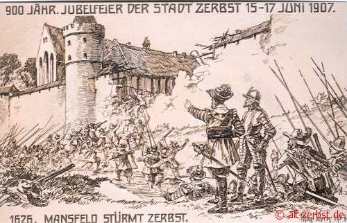 Im März 1626 betzte Ernst von Mansfeld die Stad Zerbst, um eine Basis im Kampf um die Roßlauer Elbbrücke gegen seinen Kontrahenten Wallenstein zu haben. Die Mansfelder Truppen wüteten furchtbar in der Stadt.