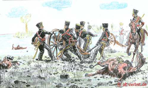 Hier am 29. April 1813 bei der 4. Kompanie der Jäger zu Fuß, wurde er zum Leutnant befördert. Am nächsten Tag marschierten sie in unsere Stadt Zerbst ein. Der hiesige Platzkommandant, Major von Arnim, musterte das Regiment auf der Breite. Bereits am nächsten Tag sollten die schwarzen Jäger weiterziehen.