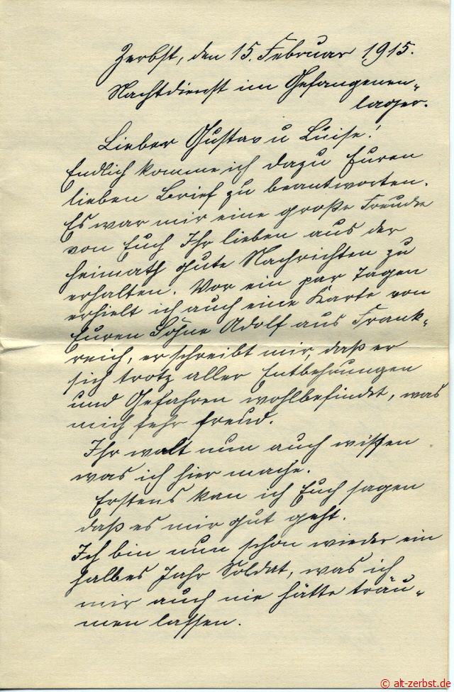 Februar 1915. Nachtdienst im Gefangenenlager. Lieber Gustav und Luise!